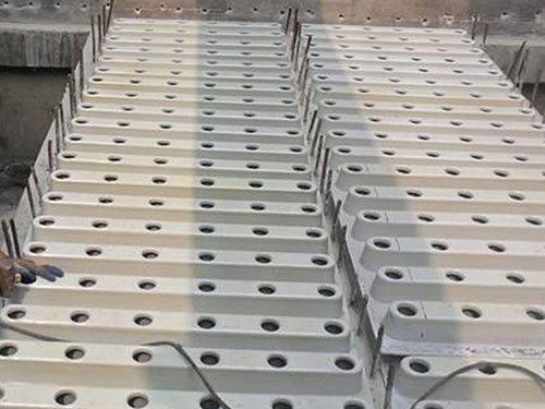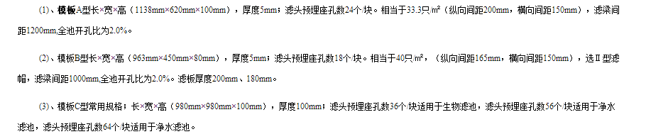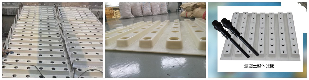 (1)整體澆筑濾板在水處理工藝中,過濾是保證水質的最重要措施,而反沖洗是使濾池得以恢復過濾能力的最關鍵環(huán)節(jié),其配水系統(tǒng)則是核心部位。尤其是氣水反沖工藝,對配水布氣系統(tǒng)有更嚴格的要求。其配水布氣的均勻程度不僅直接影響濾池的反沖效果,同時影響運行效率和運行費用。而氣水反沖工藝中,配水布氣均勻的關鍵是濾頭的平整度。其核心是控制濾桿中進氣孔和濾縫水平度。而小塊濾板,因無法直接控制濾桿進氣孔水平度,只能強調濾板的平整度。因此《濾池氣水反沖設計規(guī)范》中規(guī)定小塊濾板單板控制水平<±2mm,整池水平度<±5mm。而實際上,平板式澆筑小塊濾板保證平整度難度較大,立模式澆筑小塊濾板存在著濾板自身結構強度不均勻的弊病。